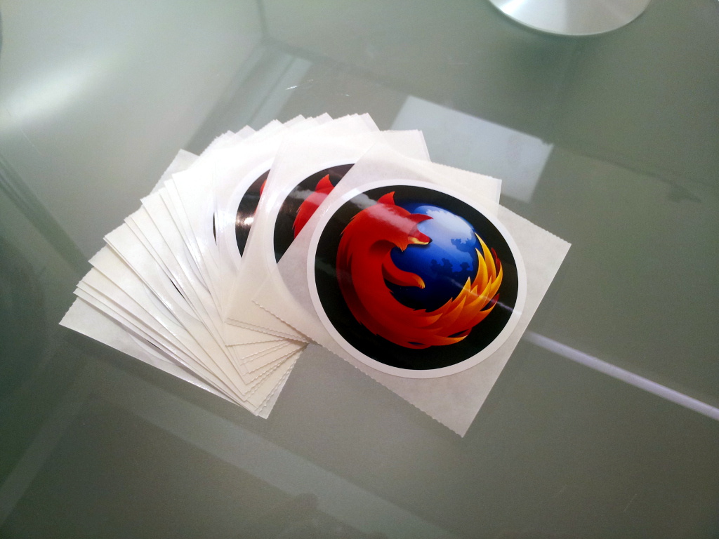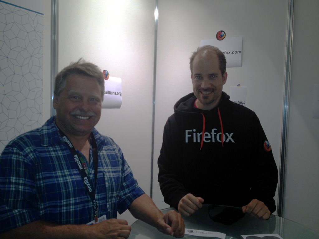 Thursday saw a slightly different Mozilla booth with a variety of stickers, pins, a Firefox OS mobile phone, posters with some hints (mozilla.org, getfirefox.com, mozillians.org) and QR codes. Unfortunately we couldn't attend the booth all the time, since there were so many interesting talks we didn't want to miss.