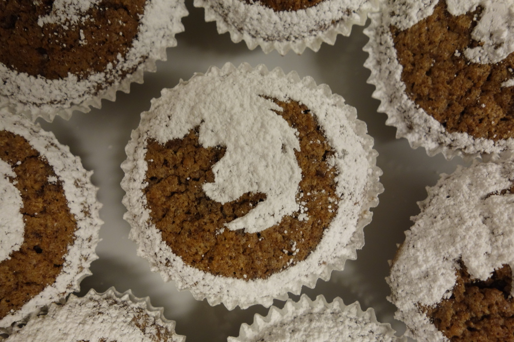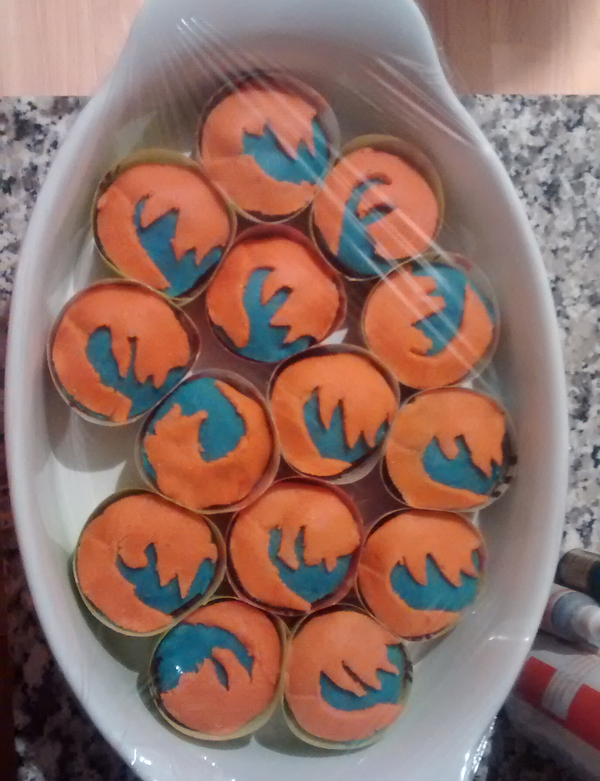 For this event I had my second chance to bake cupcakes, this time I had some advice on how to improve from a professional. I took Marzipan, colored it and cut out the Firefox logo out of it. Since it was quite hot, the Marzipan was not easily cutable without breaking, so not all of the logos looked like a fox. Nevertheless it was still recognizable. This took about 4 hours in total, but it was totally worth the effort! But psst, let's not show that to the Brand Engagement team ;)