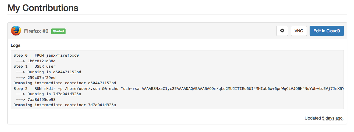 Once you're signed up, you can click on "Open in Cloud9" and directly get to the Cloud9 editor who kindly sponsor the premium accounts for this project. Cloud9 is a pure-web IDE based on real Linux environments, with an insanely fast editor.