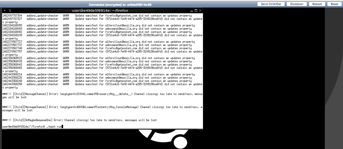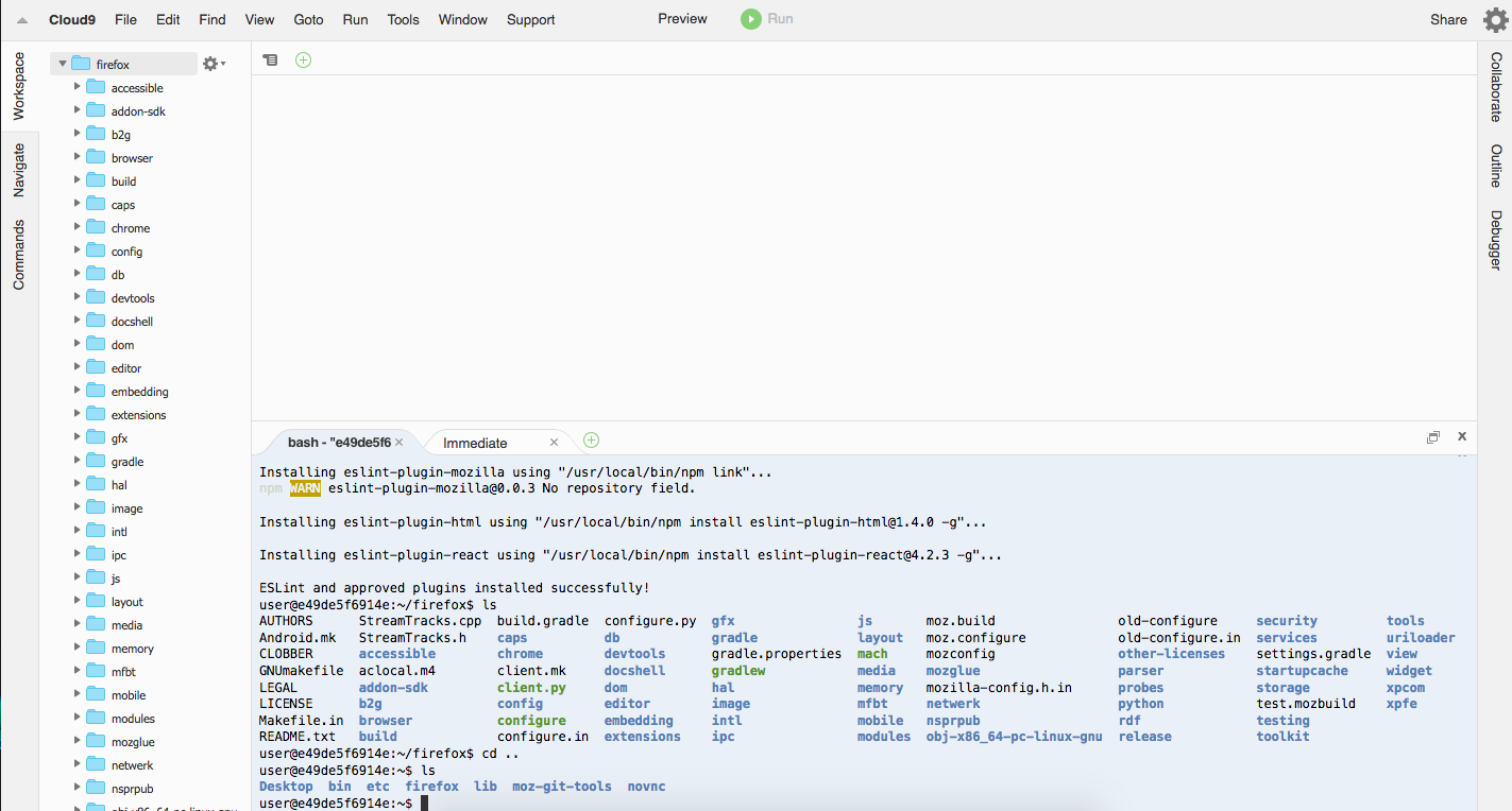 After an initial "git pull origin master" in the Cloud9 editor terminal, you can start to build Firefox in there. Simply running "./mach build" is enough. For me this took about 12 minutes for the first time, while my laptop still needs more than 50 minutes to compile Firefox. This is definitely an improvement. Further you won't need anything else than a browser!