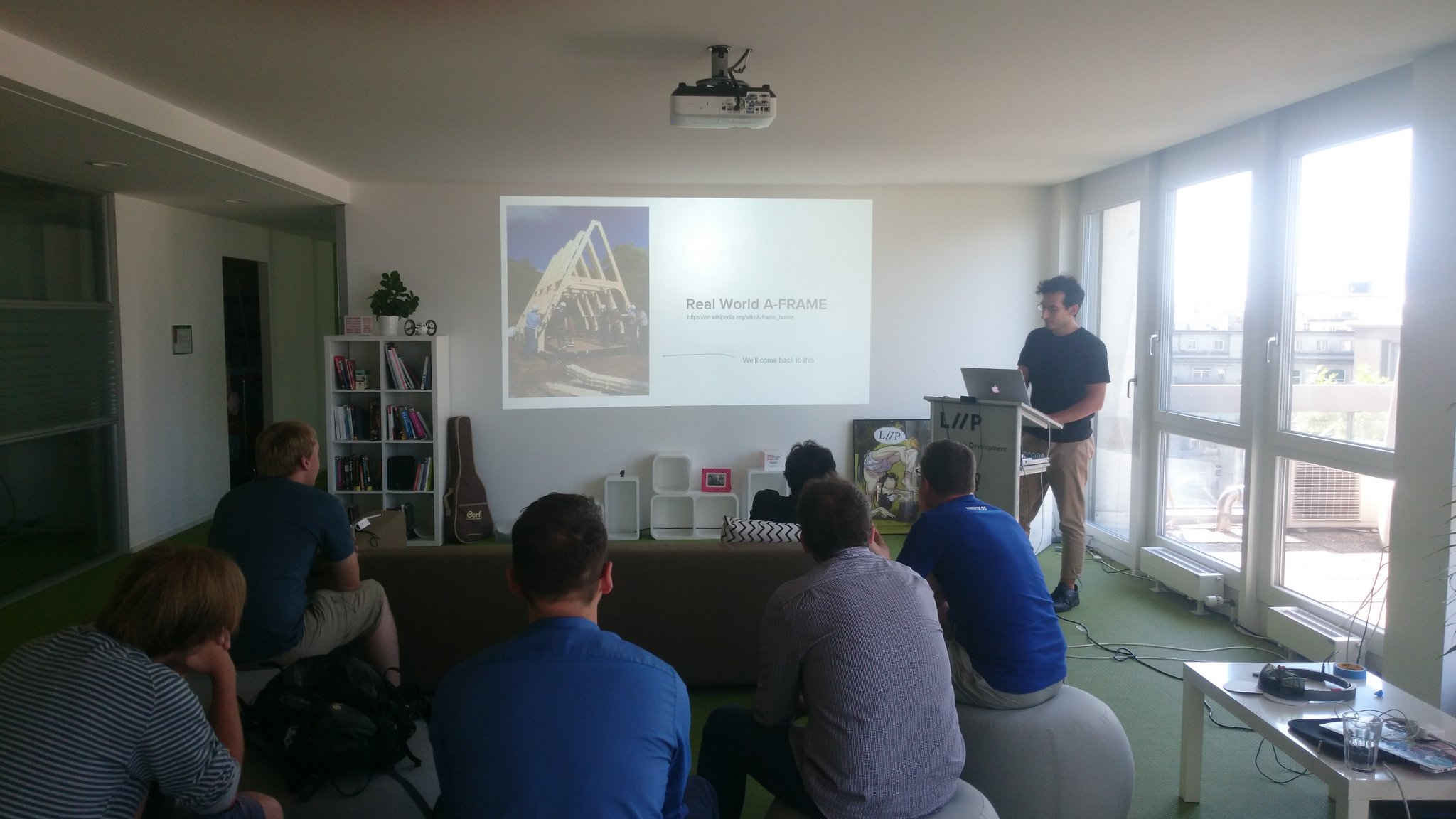 We gathered at 10 o'clock to have some initial talks and a light breakfast. It also took some time to set up the Vive and making sure we can demo A-Painter and other VR applications. At around 10:30 we started with a quick intro by Geoffroy and me. We explained the agenda and some general information about Mozilla. After that, Ben gave an intro to WebVR and how they are using A-Frame at Archilogic. It's amazing to see how it is being used in the wild for really amazing and helpful projects! Thank you for your time to come to Lausanne and present to us!