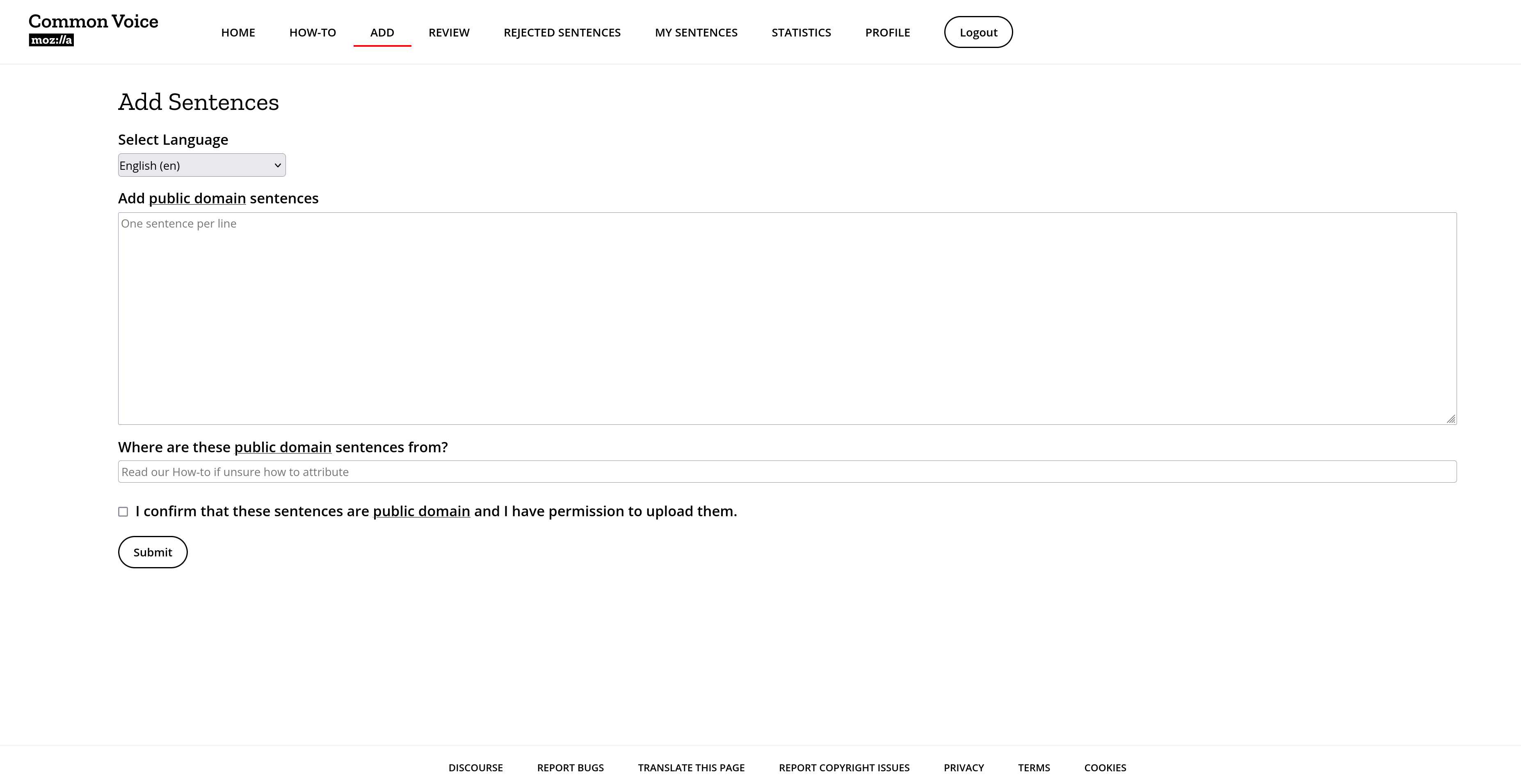 At the event we used a localization tool to submit and review sentences, as that already had a review flow. These sentences then get shown to the voice contributors to record. To get a good dataset many hours of recorded speech is necessary. Many hours of speech also means many sentences that need to be available to be recorded. As you might imagine, this does not scale well. Later that year in July Mike Henretty committed the first version of the Sentence Collector to GitHub. This then allowed as to improve upon and create a flow that specifically fits the purpose and processes of Common Voice.